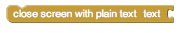 Closes the current screen and passes text to the app that opened this one. This command is for returning text to non-App Inventor activities, not to App Inventor screens. For App Inventor Screens, as in multiple screen apps, use close screen with value, not close screen with plain text.